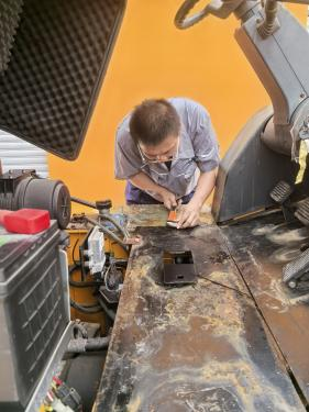 面对这一堆“瘫痪”的铁疙瘩,荆老师和吴老师没话可说,拎起工具箱就钻到了车底。吴斌老师是荆老师最可靠的战友,话不多,机械功底扎实。他们在挖掘机的复杂线束中一点点排查,汗水沿着鬓角滴落在滚烫的地面上。